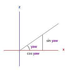 ๋น๋ณ์ ๊ธธ์ด๋ฅผ 1๋ก ์ค์ ํ์ ๋, x์ถ ๊ธฐ์ค ๋ฐ์๊ณ ๋ฐฉํฅ์ผ๋ก Yaw ๊ฐ๋๋ฅผ ์ค์ ํ๋ฉด x์ถ ๋ณ์ ๊ธธ์ด๋ cos(Yaw)๊ฐ ๋๊ณ , z์ถ ๋ณ์ ๊ธธ์ด๋ sin(Yaw)๊ฐ ๋๋ค.