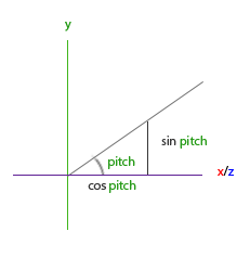 ๋ง์ฐฌ๊ฐ์ง๋ก y์ถ ๋ณ์ ๊ธธ์ด๋ sin(Pitch)๊ฐ ๋๋ค. ๋ํ xzํ๋ฉด์ ๋ณ์ด cos(Pitch)์ ์ํฅ์ ๋ฐ์ผ๋ฏ๋ก ์ต์ข ๋ฐฉํฅ ๋ฒกํฐ์ ํฌํจ์์ผ์ผ ํ๋ค.
