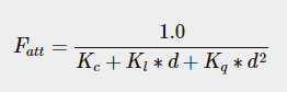 ๊ด์ ์ด ์ง๋๊ฐ ๊ฑฐ๋ฆฌ์ ๋ฐ๋ผ ๋น์ ์ธ๊ธฐ๊ฐ ์ค์ด๋๋ ๊ฒ์ Attenuation(๊ฐ์ )๋ผ๊ณ ๋ถ๋ฅธ๋ค. ๋ค์ ๊ณต์์ ๊ด์๊ณผ Fragment ์ฌ์ด์ ๊ฑฐ๋ฆฌ๋ฅผ ๊ธฐ๋ฐ์ผ๋ก ํ๋ Attenuation ๊ฐ์ ๊ณ์ฐํ๋ ๊ณต์์ด๋ค. ๋์ค์ ์ด ๊ฐ์ ๋น์ ์ธ๊ธฐ ๋ฒกํฐ์ ๊ณฑํ ๊ฒ์ด๋ค.